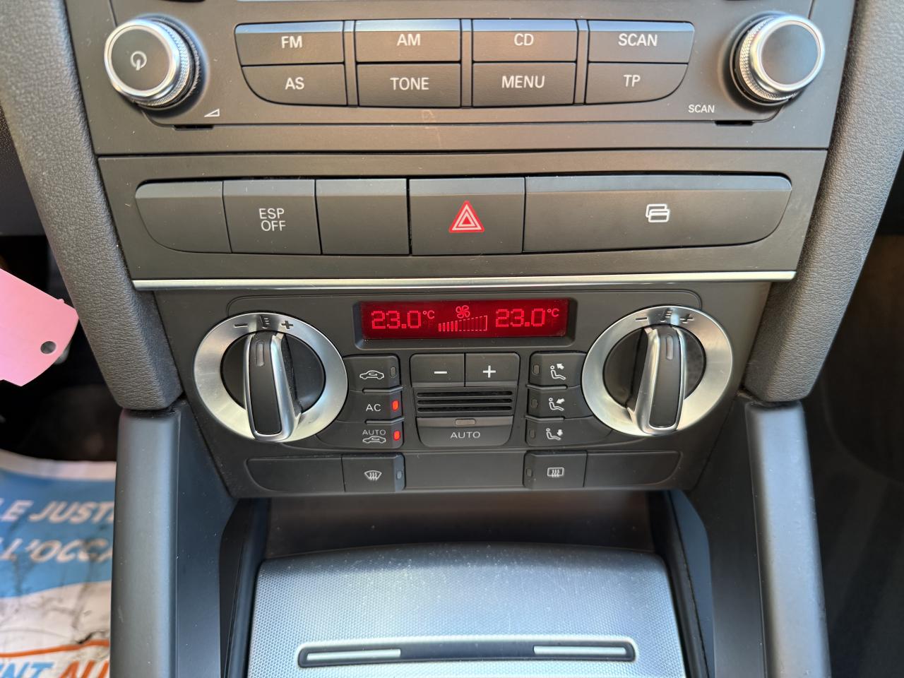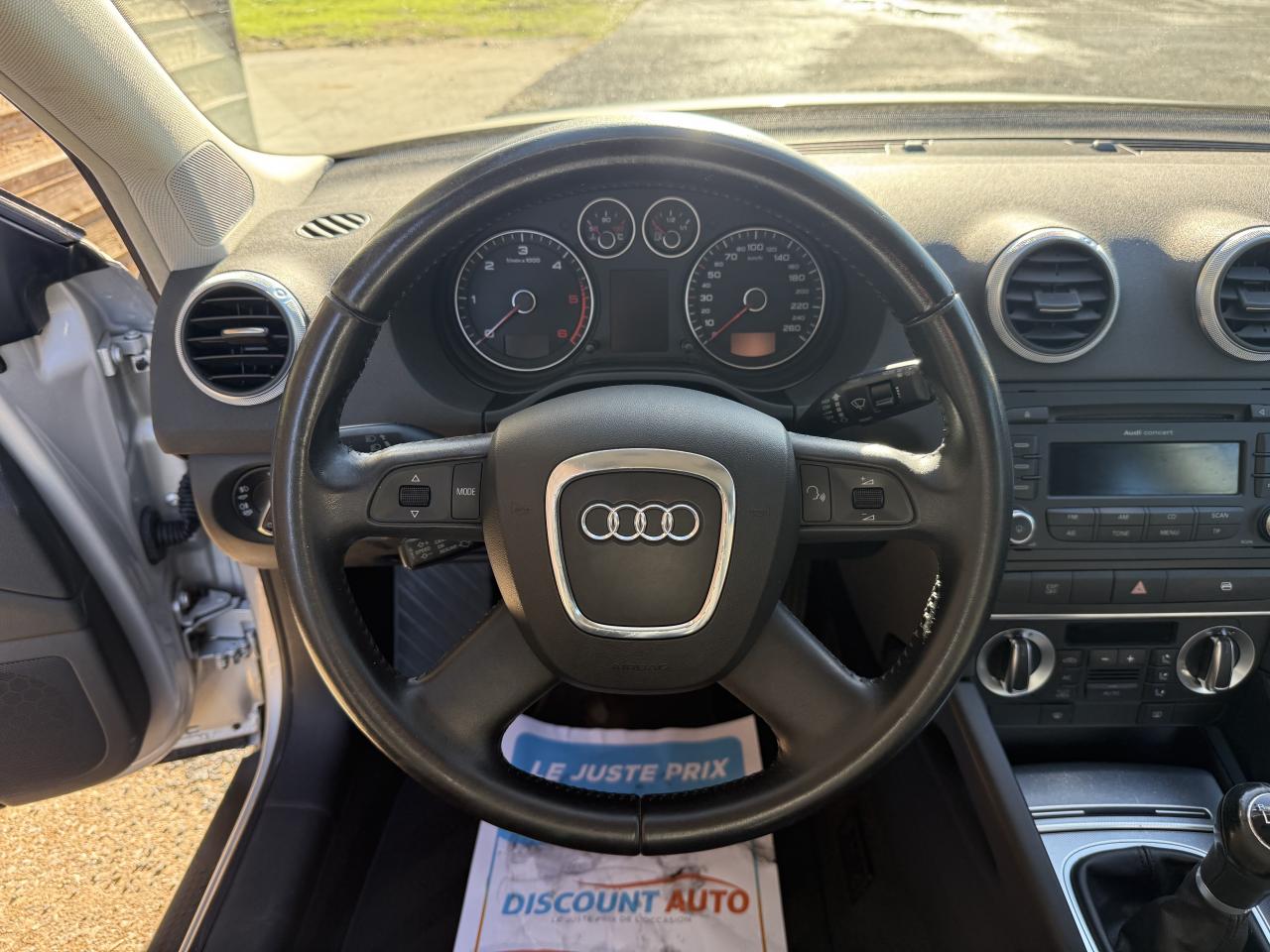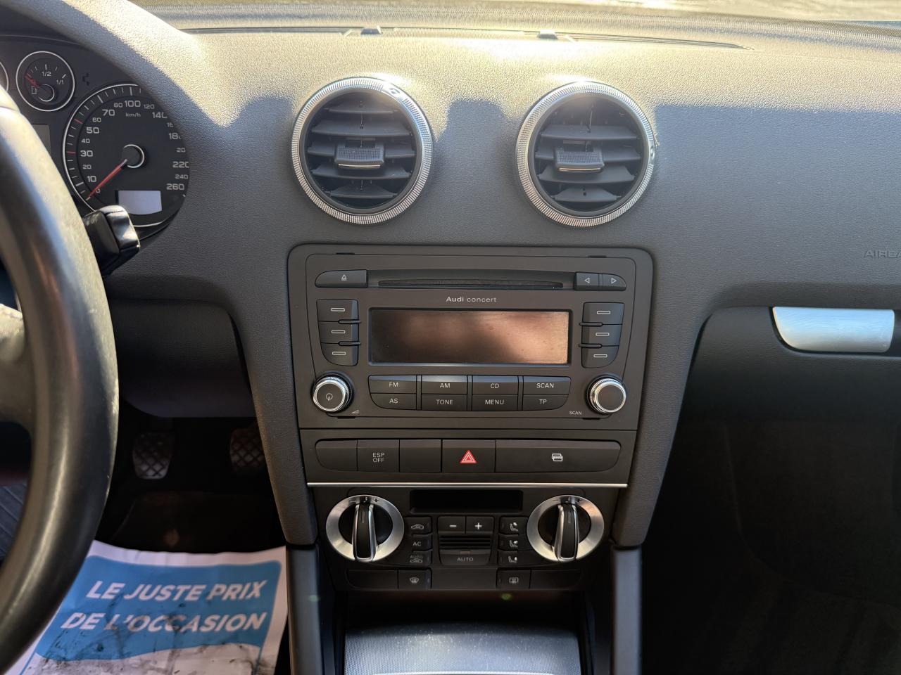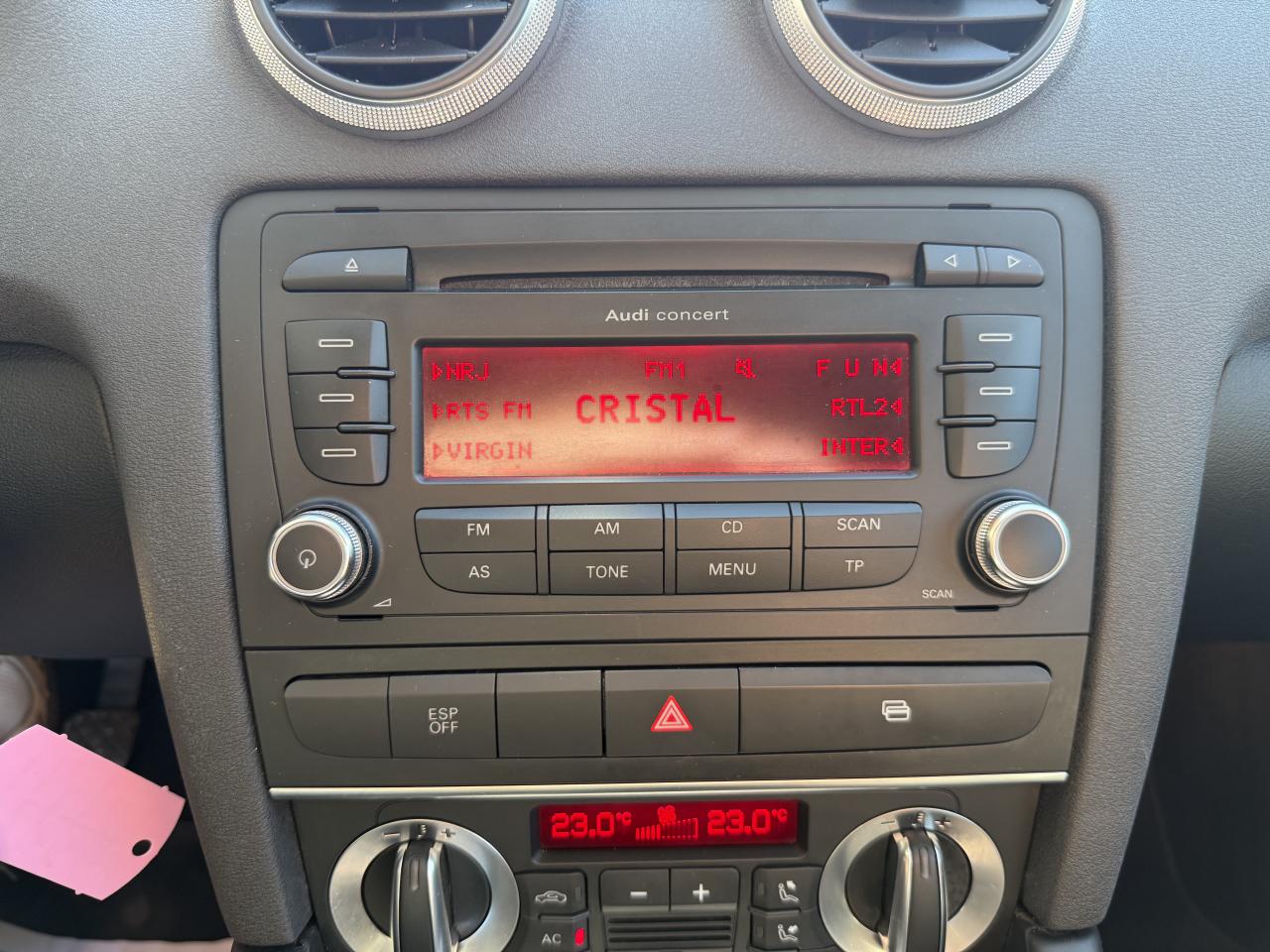 3ème feu stop arrièreABS (Antiblocage de roues)Accoudoir central avant, avec vide-poches relevable et inclinaison réglableAirbags (conducteur, passager avant, airbag latéral, airbag de tête)Antipatinage ASR : empêche le patinage des roues motrices ; assure une motricité optimaleApplications décoratives platine micrométalliqueApplications décoratives sur les portières, différentes selon la finition choisieAppuie-tête à toutes les places, actifs à l'avant ; réglables à l'avant et à l'arrièreAudi Backguard, en cas de collision arrière, la conception du siège permet l'amortissement du haut du corps et le soutien plus précoce de la têteAvertisseur ''2 tons''Baguettes de protection latérales couleur carrosserieBaguettes de seuil de portes avec inserts en aluminium et inscription AudiBanquette arrière rabattable 1/3-2/3BAS : amplificateur électronique de freinage d'urgenceBoîte à gants grand volume côté passager avant, éclairéeCache-bagagesCarrosserie galvanisée, autoportante, soudée au groupe plancherCatadioptres de portière passifsCeintures de sécurité trois points à enrouleur à toutes les placesChâssis “Sport”Climatisation automatique Confort avec réglage asservi à la position du soleilColonne de direction de sécuritéCommande des feux pour feux de stationnement, feux de route, projecteurs antibrouillards et feu arrière de brouillardConsole centrale avec commandes du chauffage et vide-pochesCrochets pour sacs à gauche et à droite dans le coffreDétecteur d'occupation des sièges avantDétecteur de luminosité et de pluie + fonction Coming Home/Leaving HomeDétecteur de pluie et allumage automatique des projecteursDéverrouillage du coffre par touche assistée électriquement, commande supplémentaire pour déverrouiller le coffre depuis la place conducteurDirection assistée électromécanique, assistance asservie à la vitesseEasy Entry : fonction étendue de basculement des sièges avant permettant un accès facile aux places arrièreEBV : Répartiteur électronique de freinageEclairage blanc, réglable, sur les instruments ; éclairage rouge sur les commandes et le tableau de la climatisationEclairage intérieur à extinction temporisée et contacteurs sur toutes les portièresEcrous antivolEDS (blocage électronique de différentiel)Essuie-glace arrière avec commande de lavage-balayage automatiqueEssuie-glace deux vitesses avec commande automatiqueFeux arrière rouges, feu de recul blanc, avec feu arrière de brouillardFreins à disques à l'avant et à l'arrière, ventilés à l'avantHabillage de portières avec partie centrale en tissu et accoudoir intégréIndicateur de température extérieureInscriptions sur le capot de coffre. À gauche : A3, au centre : anneaux Audi, à droite : identification du modèleInstrumentation à éclairage réglableJantes en aluminium coulé style 5 branches en étoile, 7,5 J x 17”, avec pneus 225/45 R 17Lunette arrière dégivrante, avec minuterieMiroir de courtoisie côté conducteur et passagerMoquetteOeilletons de fixation dans le coffreOrdinateur de bord avec contrôle autocheck et indicateur de température extérieureOutillage de bordPare-chocs dans la couleur de la carrosseriePare-soleil gauche et droite rabattables et orientables avec miroir de courtoisie éclairé et occultable, troisième pare-soleil rabattable au-dessus du rétroviseur intérieurPare-soleil pour la lunette arrièrePare-soleil pour lunette arrière rabattable manuellementPatères sur les montants de pavillon centraux, 2 patèresPoignées de maintien, quatre, encastrées dans le pavillon, rabattables avec amortisseurPoignées de portières affleurantes dans la couleur de carrosseriePommeau et soufflet de levier de vitesse en cuir, anneau décoratif style aluminiumPorte-boissons avant avec jalousie, double, sur le tunnel centralPrise de courant à l'avant, avec vide-poches sur la console centraleProgramme de stabilité électronique (ESP)Projecteurs antibrouillard ellipsoïdaux intégrés au bouclier avantProjecteurs antibrouillard halogène AVProjecteurs halogènes à surfaces libres sous vitre transparente, feux diurnes, réglage électrique du site des phares et commande de feu de stationnementProtection anticollision latérale dans les portières, constituée de profilés d'aluminium rigidesProtection antidémarrage électroniqueProtection durable sous le plancher et dans les passages de roueRadio Concert, avec lecteur CD en façade et compatibilité MP3, mémoire pour 12 stations, réception FM et AM (MO), clavier à touches douces et écran trois lignes, réglage de volume asservi à la vitesse, phases diversifiées, 8 haut-parleurRadio Concert, avec lecteur CD en façade et compatibilité MP3, prise AUX-INRégulateur de vitesseRepose-pied à côté de la pédale d'embrayageRéservoir situé dans une zone protégéeRétroviseur intérieur jour/nuit dans la couleur du ciel de pavillonRétroviseurs extérieurs avec rappels de clignotant à diodes, réglables électriquement, boîtiers dans la couleur de la carrosserie, miroir convexe côté passagerRoue de secours temporaireSellerie tissu DynamiqueSiège conducteur réglable en hauteurSiège passager avant réglable en hauteur manuellementSiège passager réglable en hauteurSièges avant avec position avant/arrière et inclinaison du dossier réglables manuellement ; appuie-têtes réglables et ceintures réglables en hauteurSièges avant Sport avec bourrelets latéraux enveloppant pour un meilleur maintien dans les viragesSignal sonore pour oubli d'extinction des feux ; éclairage des instruments réglable en continuSingleframe : encadrement décoratif chromé sur la calandre avec anneaux Audi anodisés au centreSite des phares réglable manuellementSoft Touch : Assistance électrique permettant un déverrouillage sans effort du capot de coffreSortie d'échappement visible, doubleSortie d'échappement visible, simpleSystème d'airbags de tête sideguardSystème d'informat